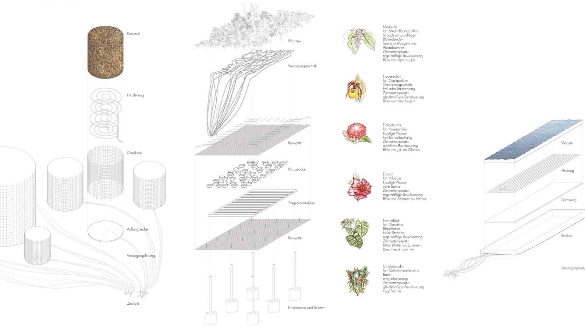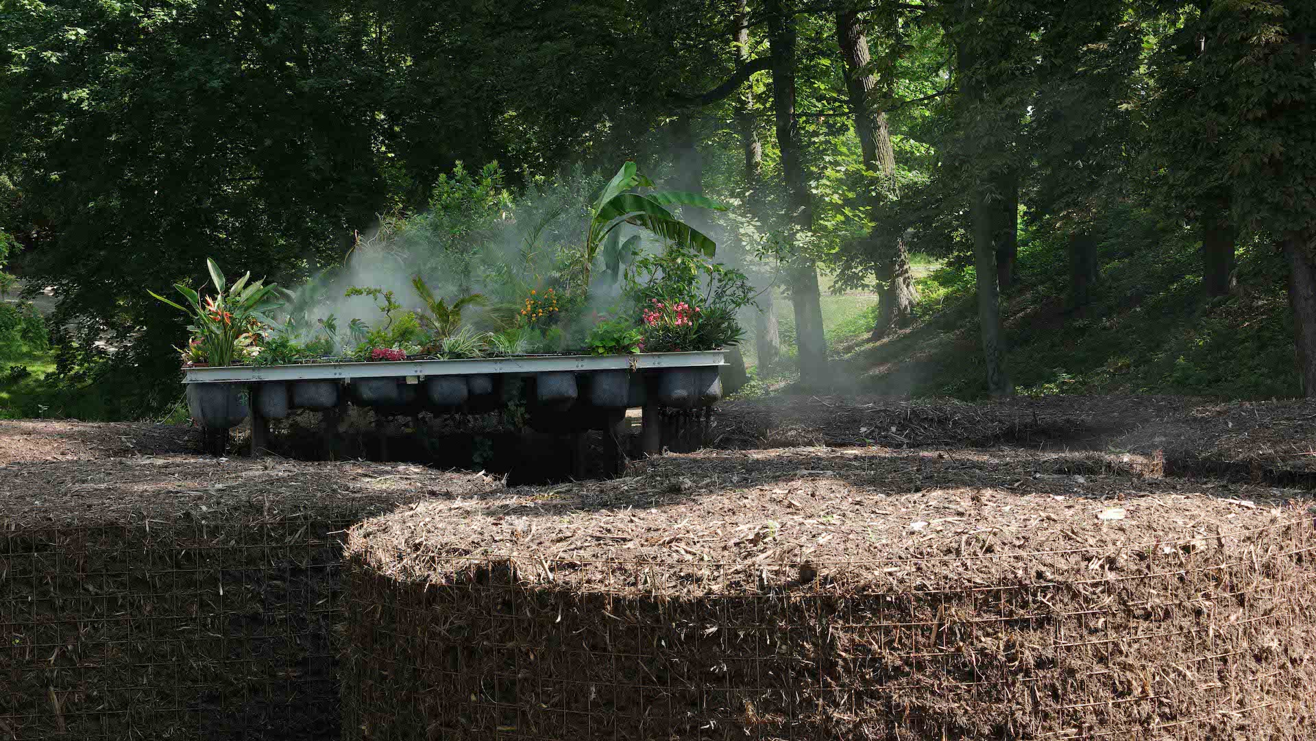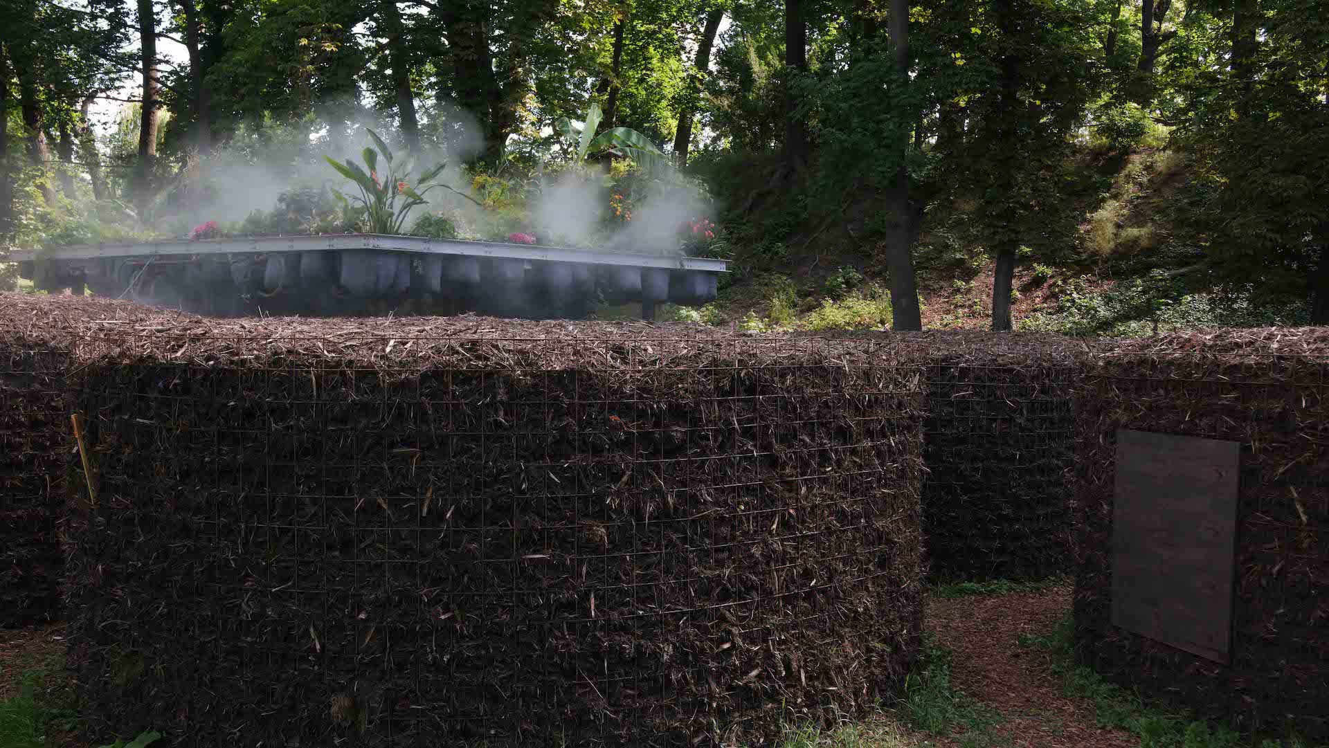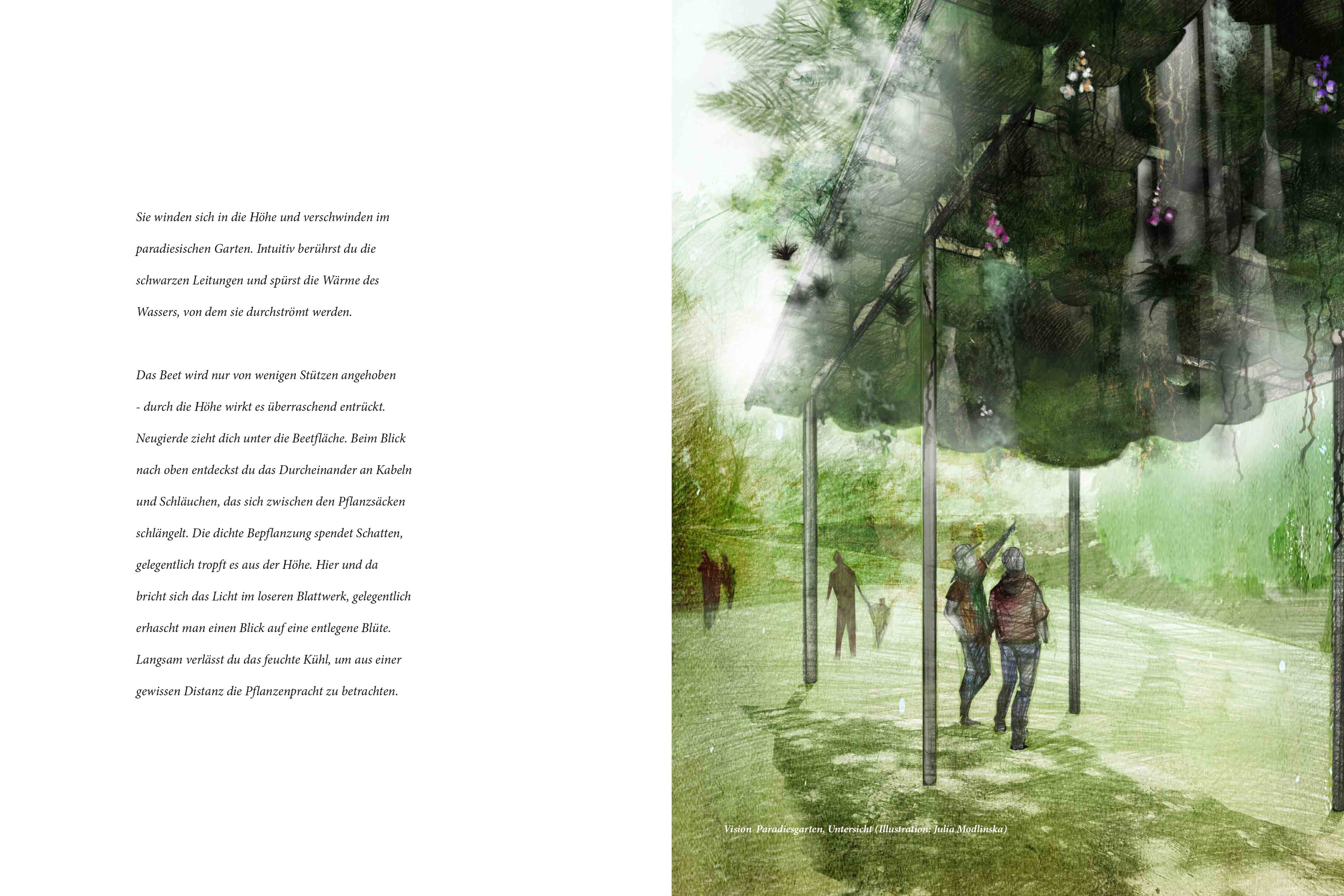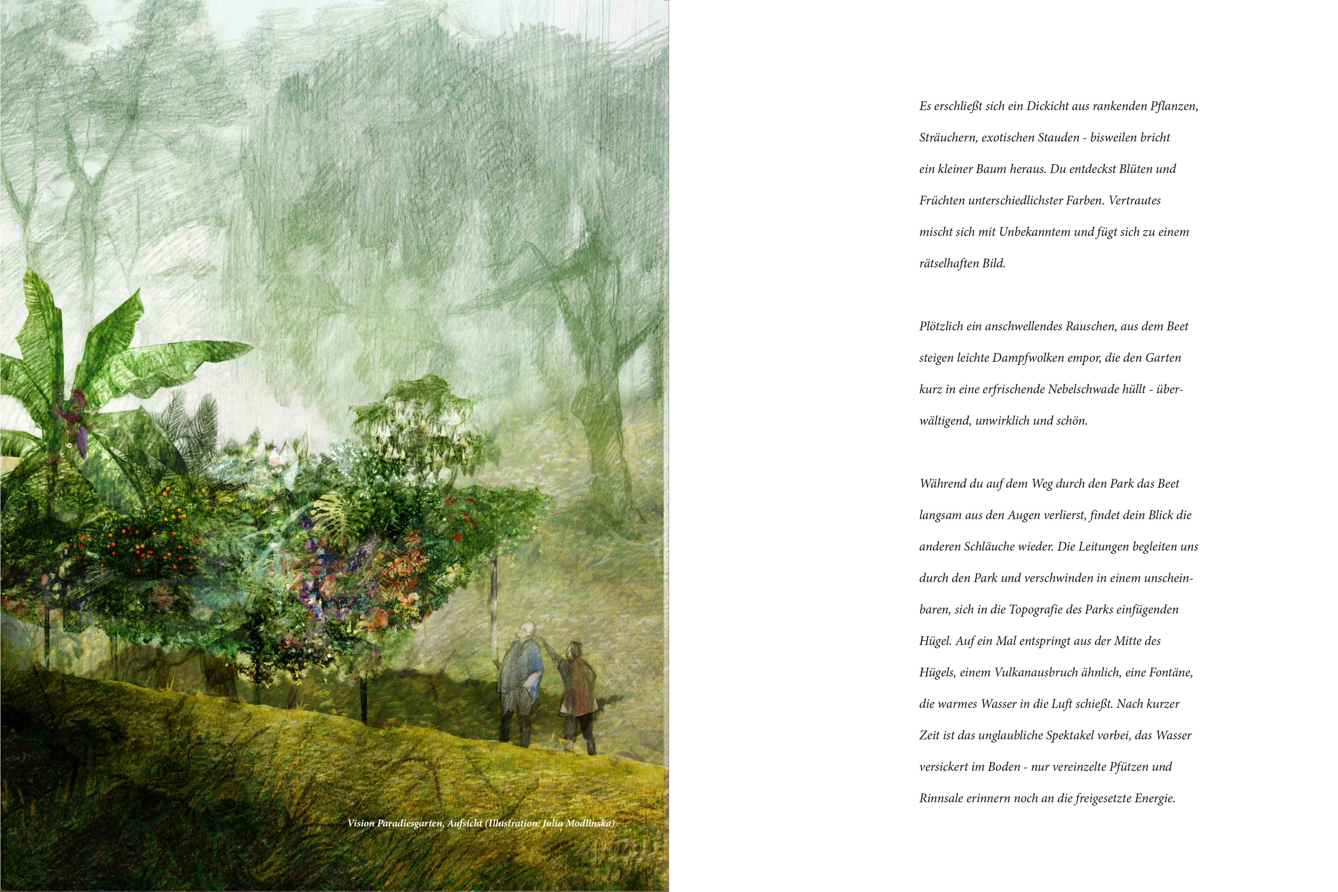Aus dem Erläuterungsbericht: »Die Luft ist warm und es riecht nach feuchter, frischer Erde. Es ist seltsam windgeschützt zwischen den neun großen, dunklen, schwerfälligen Kompostkörpern. Die Formen sind unterschiedlich, manche groß und schlank, andere breit und flach. Der Tag zwischen den Erdformen ist halb Licht und halb Schatten. (...) Schwarze faustdicke Kabel laufen aus den Zylindern über den Boden zu einem scheinbar gemeinsamen Ziel. (...) Die Kabelenden laufen auf drei Meter Höhe in einen paradiesischen Garten. Das Beet steht schräg im Hang, die Wiese darunter ist begehbar. Die bepflanzte Fläche ist nur wenige Meter entfernt und ebenerdig zum höher gelegenen Weg. Tropische, bunte Pflanzen und Palmen wuchern nach oben, Luftwurzeln und Rankpflanzen wachsen zwischen den Stützen unter dem Beet und ergeben eine mit der Zeit dichter werdende Pflanzenhöhle. Plötzlich ein anschwellendes Rauschen, aus dem Beet steigt eine Dampfwolke empor, die den Garten in Nebel hüllt und langsam in kleinen Tropfen zu Boden rieselt oder einfach weggeweht wird. (...)