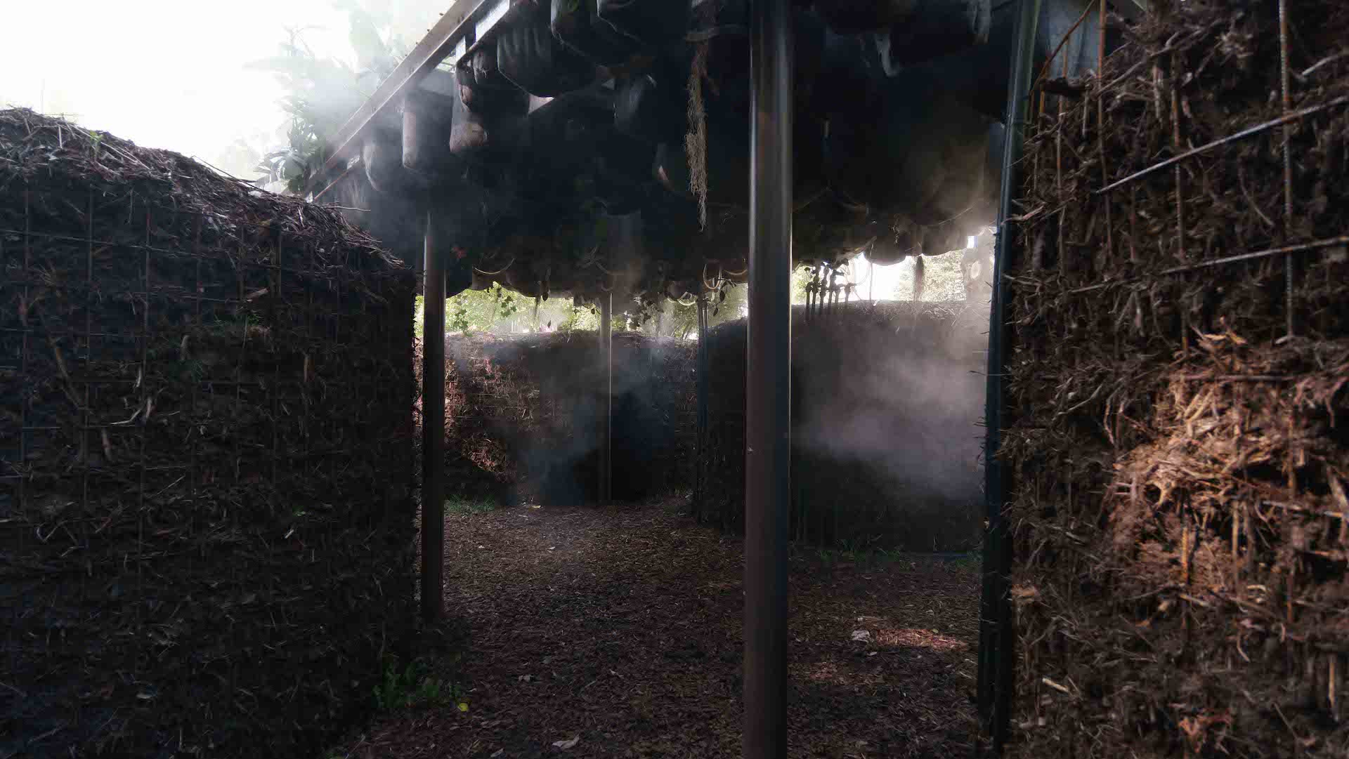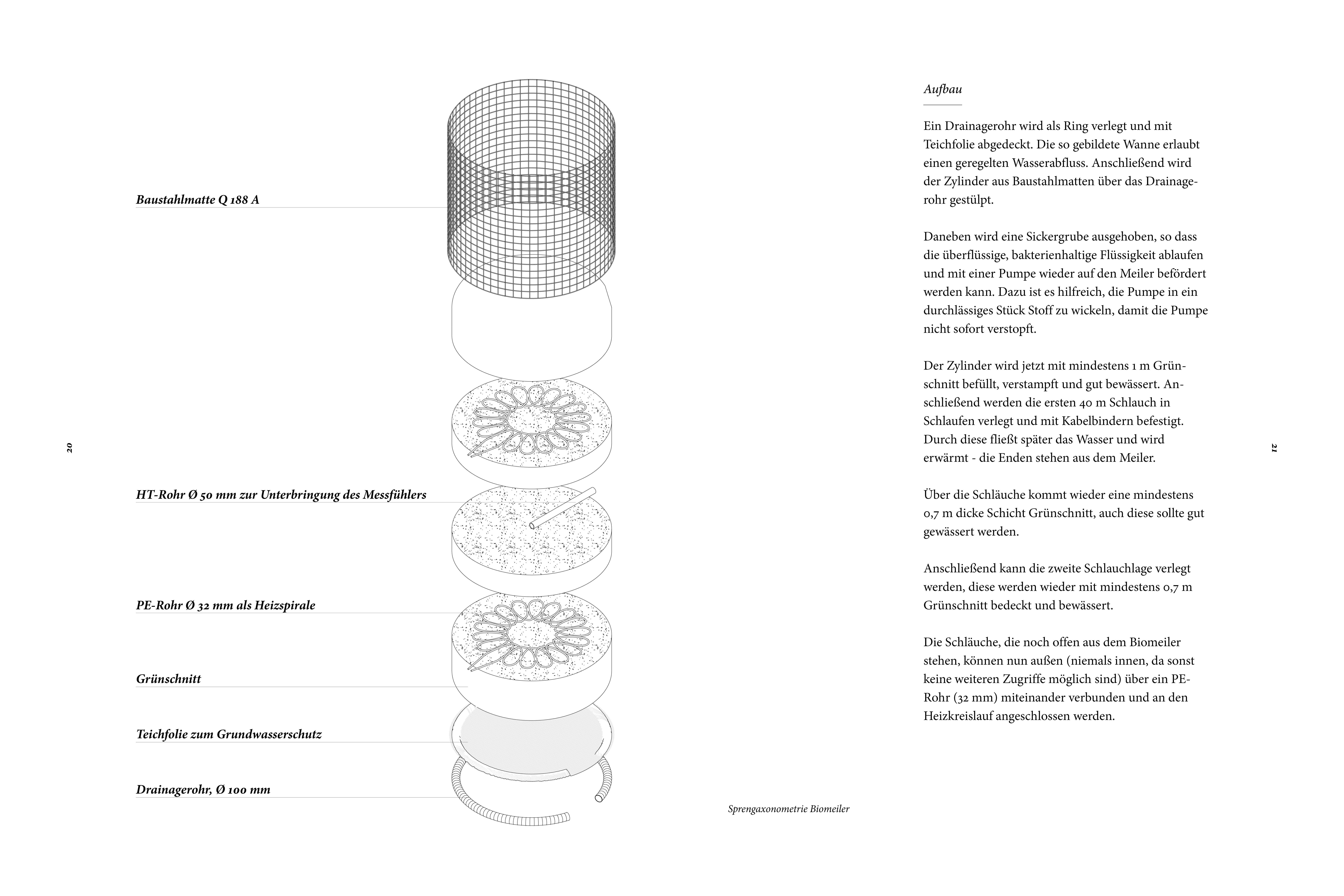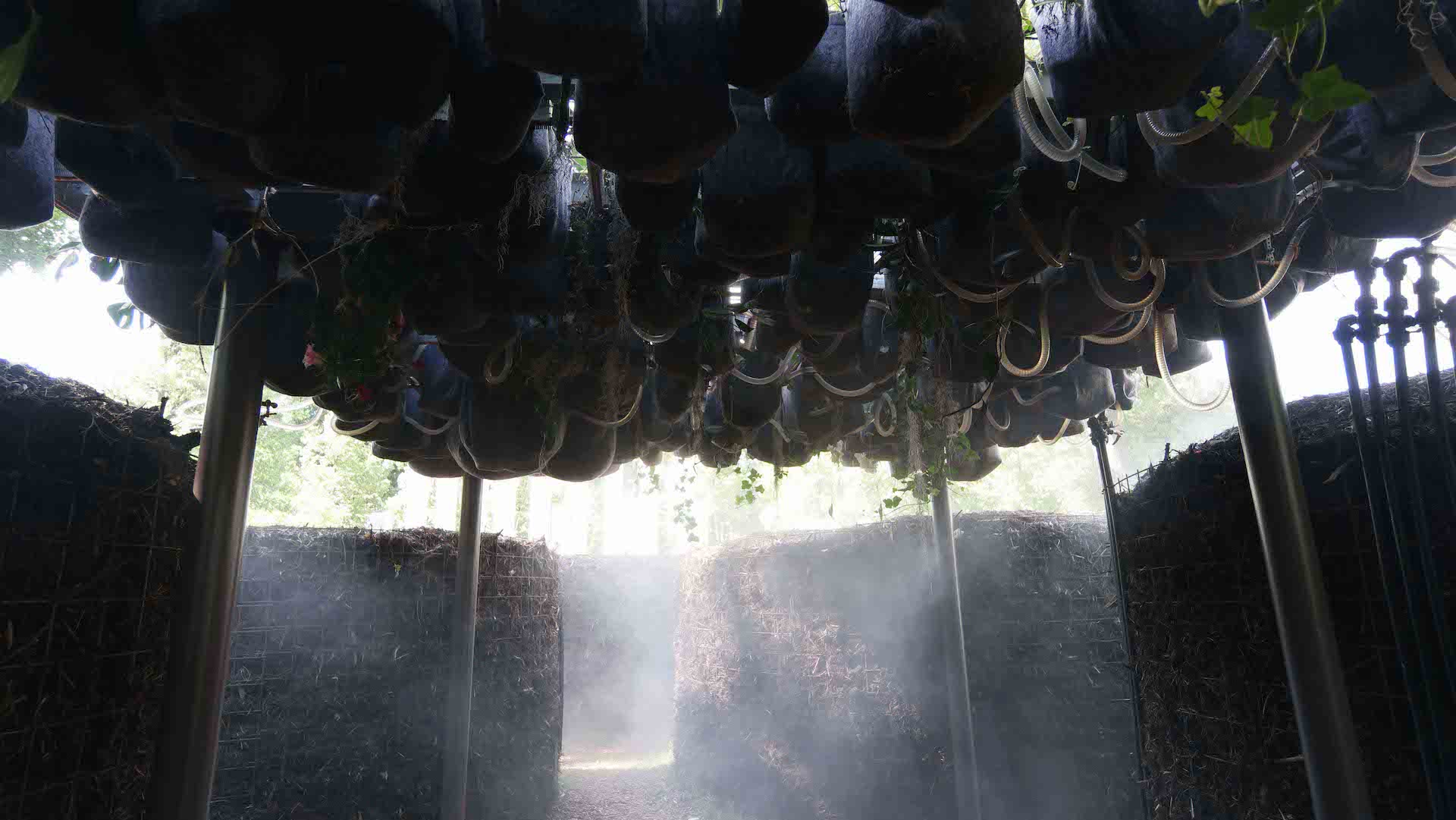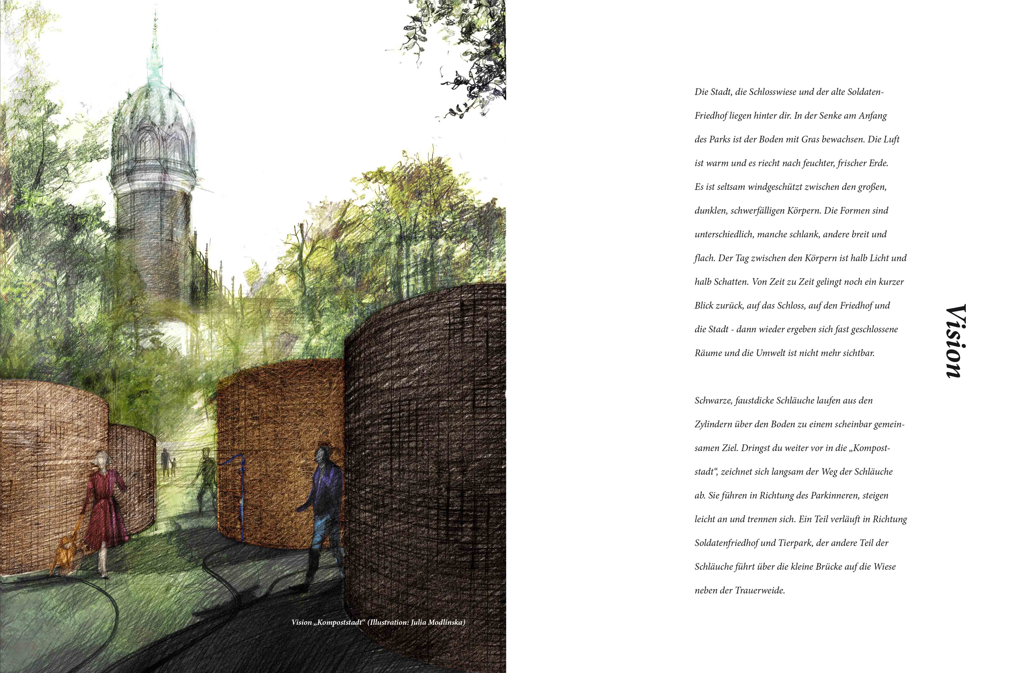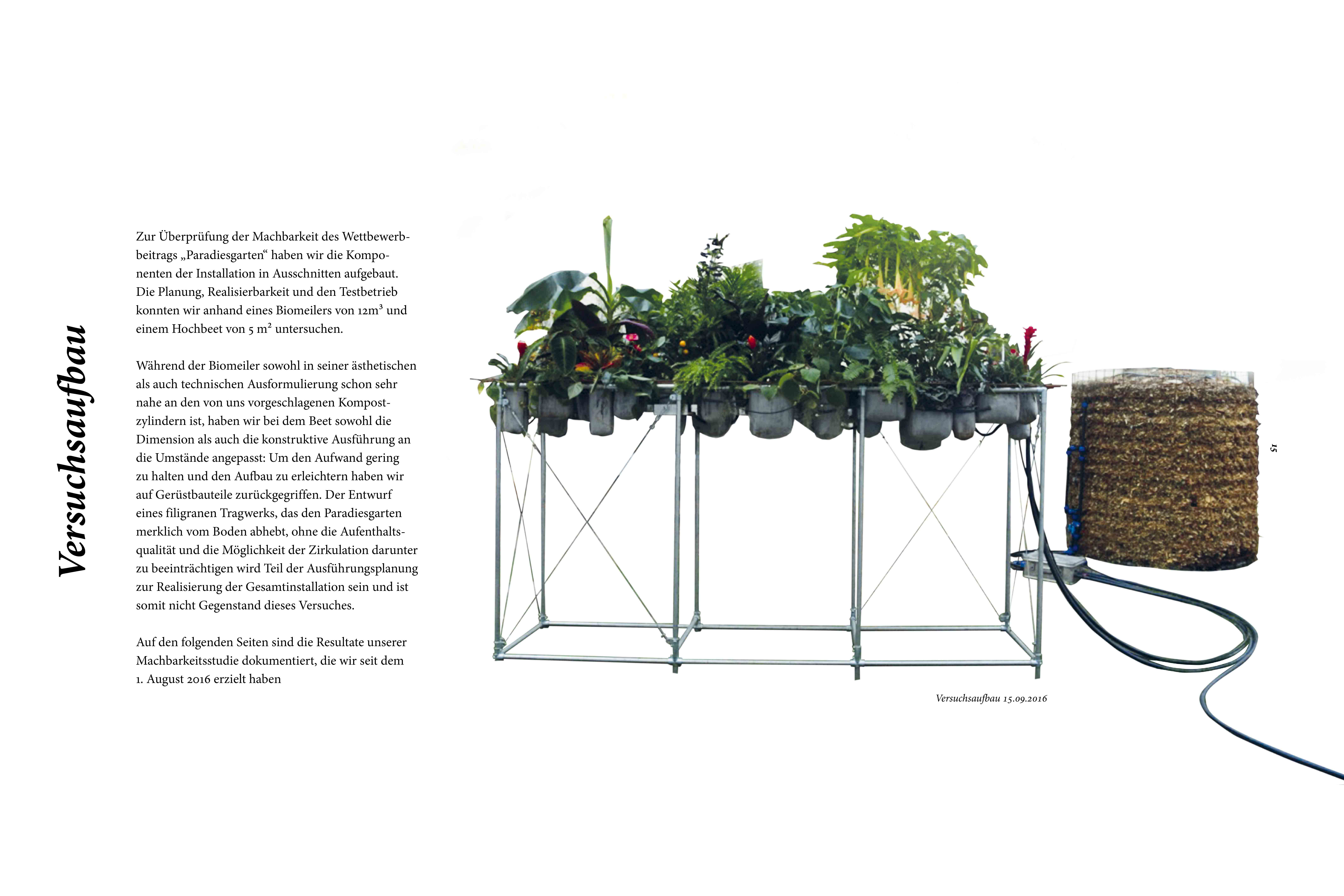 Aus dem Erläuterungsbericht: »Die Luft ist warm und es riecht nach feuchter, frischer Erde. Es ist seltsam windgeschützt zwischen den neun großen, dunklen, schwerfälligen Kompostkörpern. Die Formen sind unterschiedlich, manche groß und schlank, andere breit und flach. Der Tag zwischen den Erdformen ist halb Licht und halb Schatten. (...) Schwarze faustdicke Kabel laufen aus den Zylindern über den Boden zu einem scheinbar gemeinsamen Ziel. (...) Die Kabelenden laufen auf drei Meter Höhe in einen paradiesischen Garten. Das Beet steht schräg im Hang, die Wiese darunter ist begehbar. Die bepflanzte Fläche ist nur wenige Meter entfernt und ebenerdig zum höher gelegenen Weg. Tropische, bunte Pflanzen und Palmen wuchern nach oben, Luftwurzeln und Rankpflanzen wachsen zwischen den Stützen unter dem Beet und ergeben eine mit der Zeit dichter werdende Pflanzenhöhle. Plötzlich ein anschwellendes Rauschen, aus dem Beet steigt eine Dampfwolke empor, die den Garten in Nebel hüllt und langsam in kleinen Tropfen zu Boden rieselt oder einfach weggeweht wird. (...)