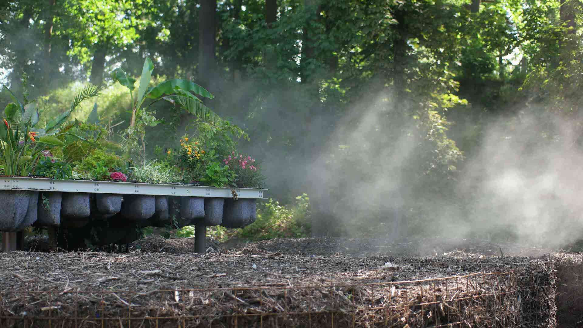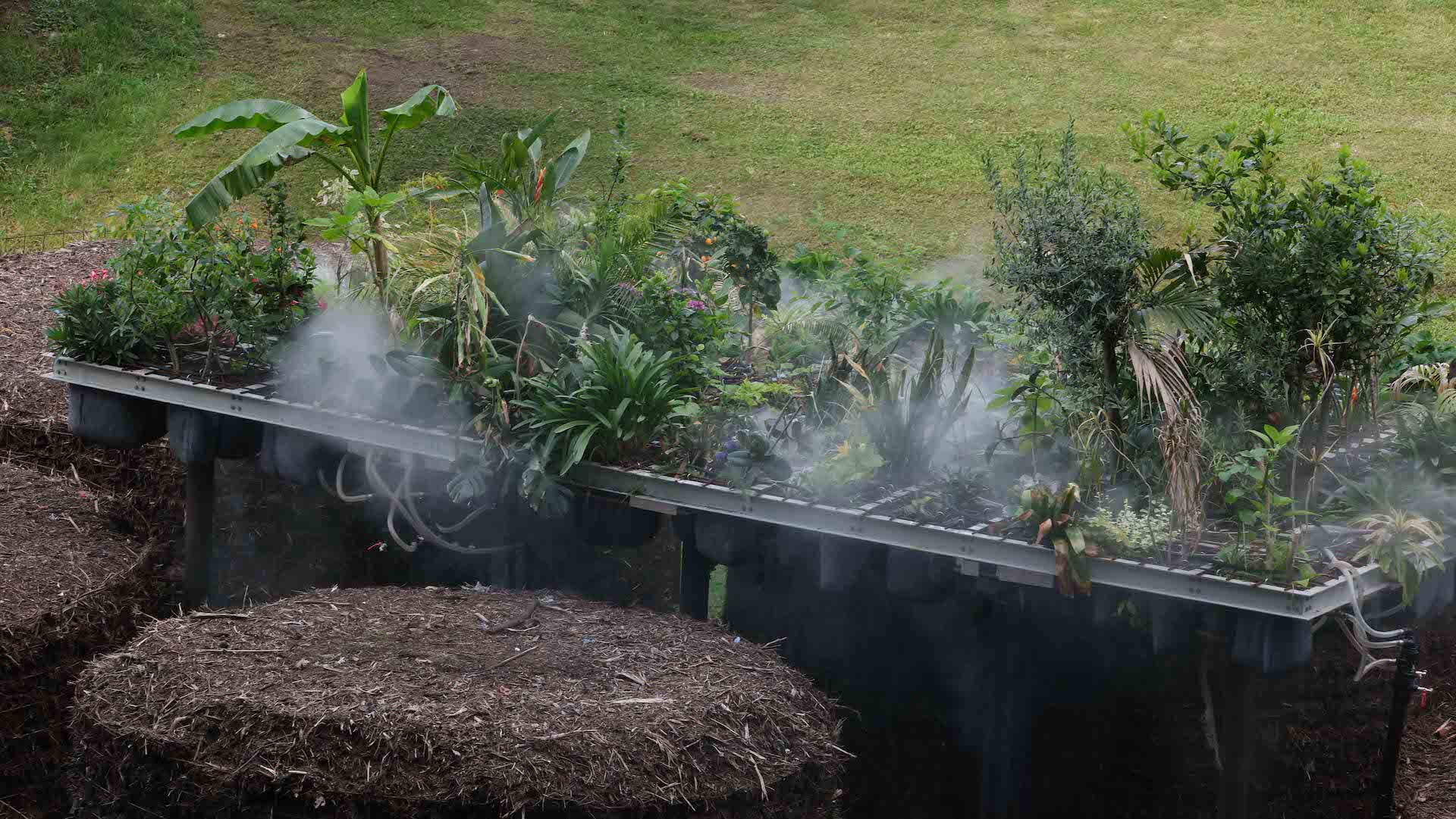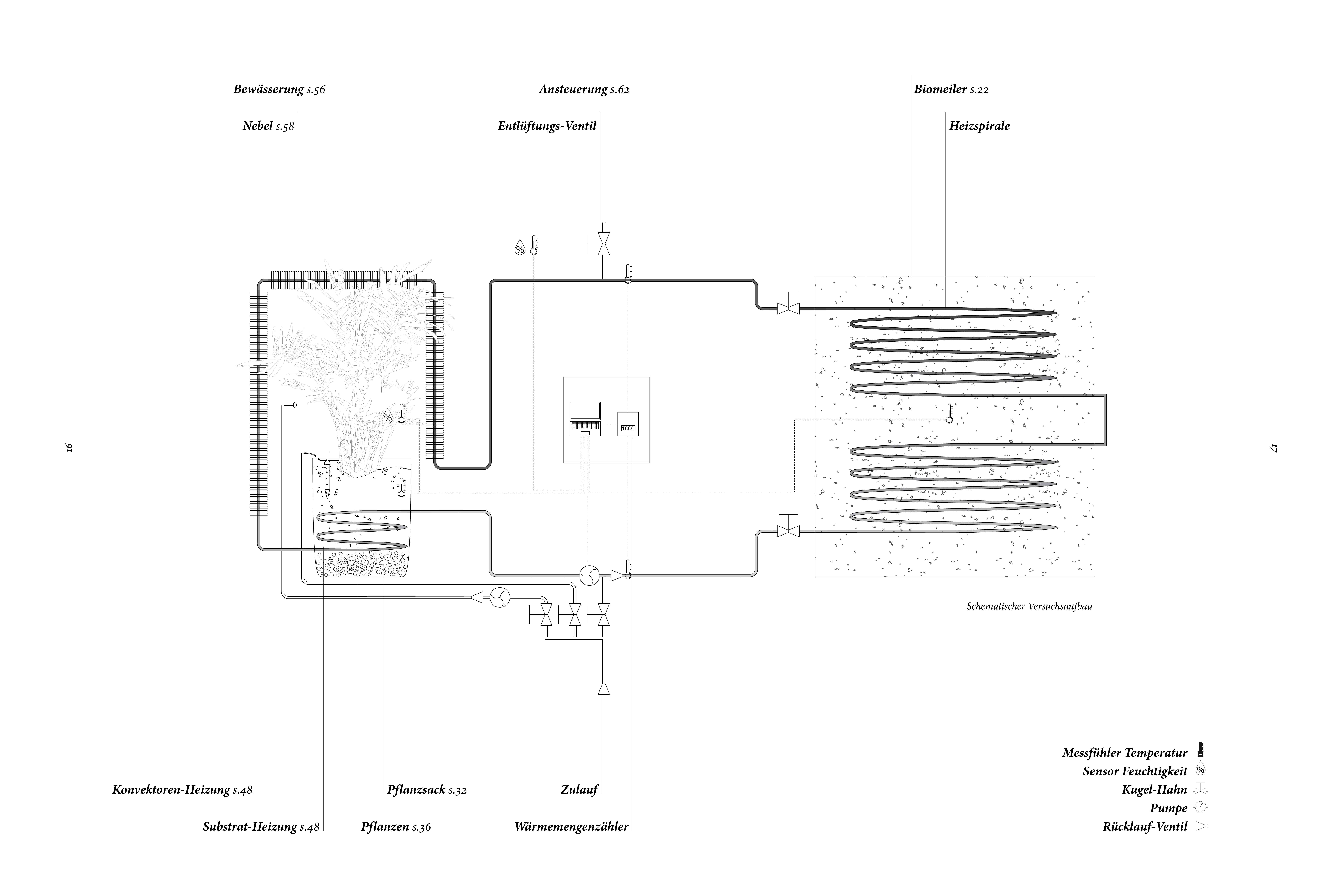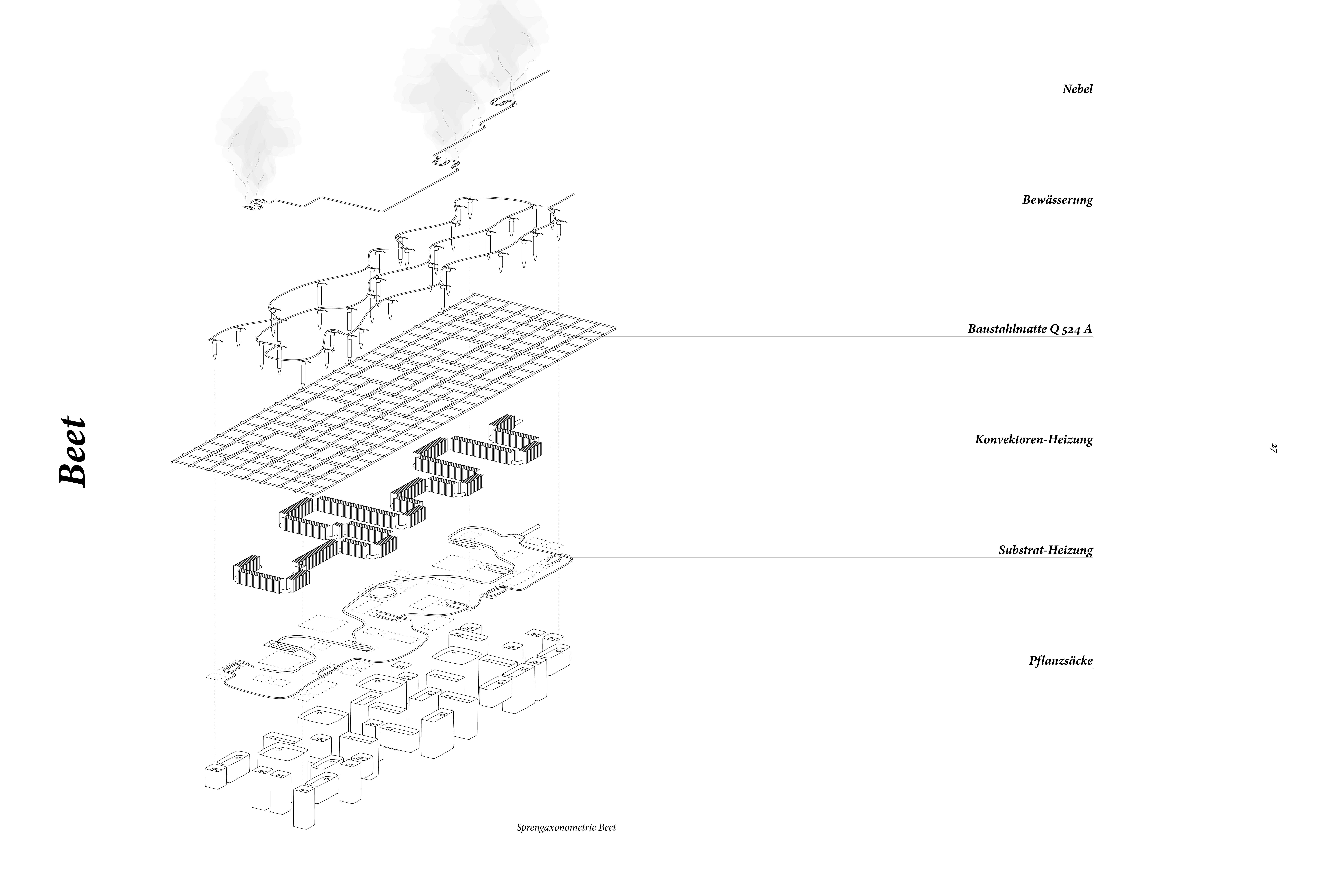 Aus dem Erläuterungsbericht: »Die Luft ist warm und es riecht nach feuchter, frischer Erde. Es ist seltsam windgeschützt zwischen den neun großen, dunklen, schwerfälligen Kompostkörpern. Die Formen sind unterschiedlich, manche groß und schlank, andere breit und flach. Der Tag zwischen den Erdformen ist halb Licht und halb Schatten. (...) Schwarze faustdicke Kabel laufen aus den Zylindern über den Boden zu einem scheinbar gemeinsamen Ziel. (...) Die Kabelenden laufen auf drei Meter Höhe in einen paradiesischen Garten. Das Beet steht schräg im Hang, die Wiese darunter ist begehbar. Die bepflanzte Fläche ist nur wenige Meter entfernt und ebenerdig zum höher gelegenen Weg. Tropische, bunte Pflanzen und Palmen wuchern nach oben, Luftwurzeln und Rankpflanzen wachsen zwischen den Stützen unter dem Beet und ergeben eine mit der Zeit dichter werdende Pflanzenhöhle. Plötzlich ein anschwellendes Rauschen, aus dem Beet steigt eine Dampfwolke empor, die den Garten in Nebel hüllt und langsam in kleinen Tropfen zu Boden rieselt oder einfach weggeweht wird. (...)