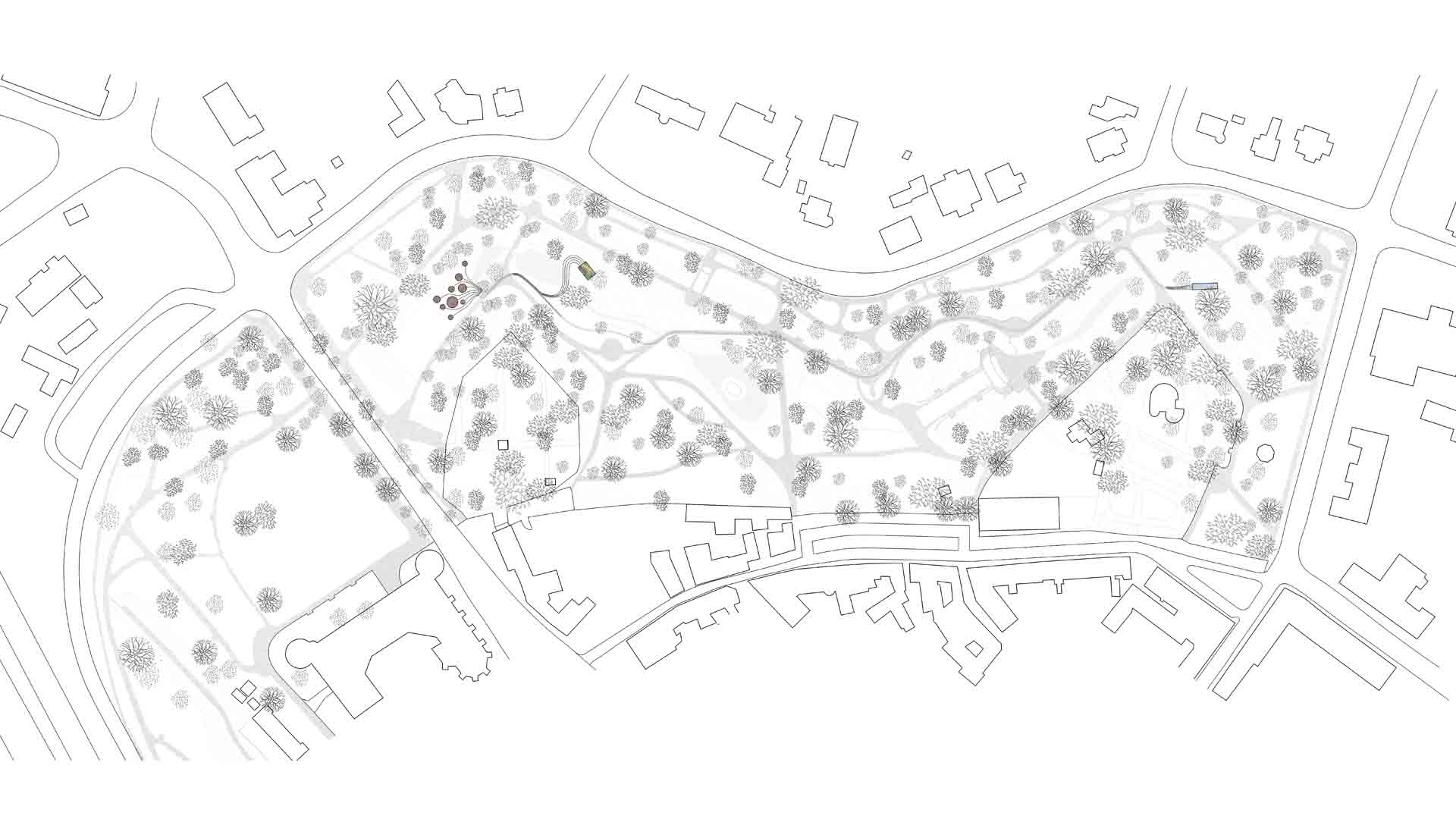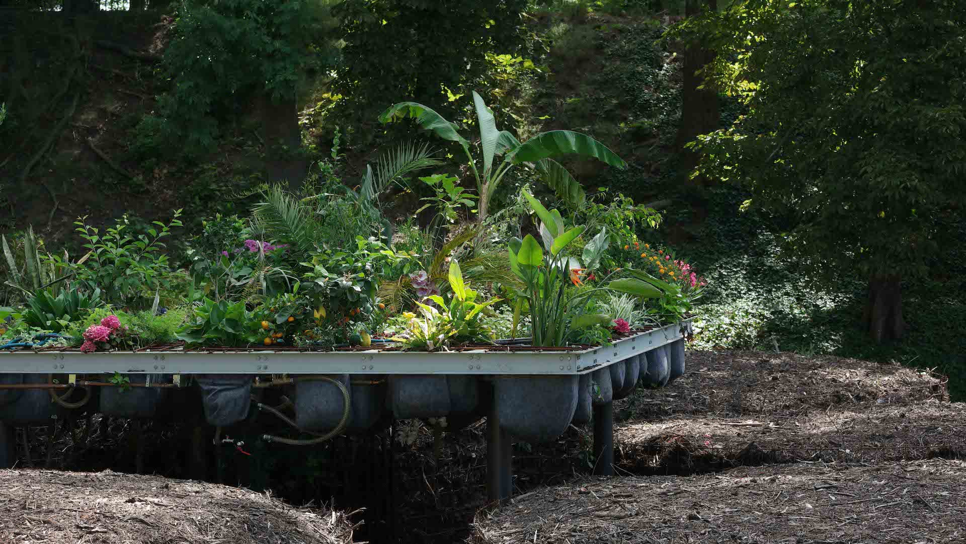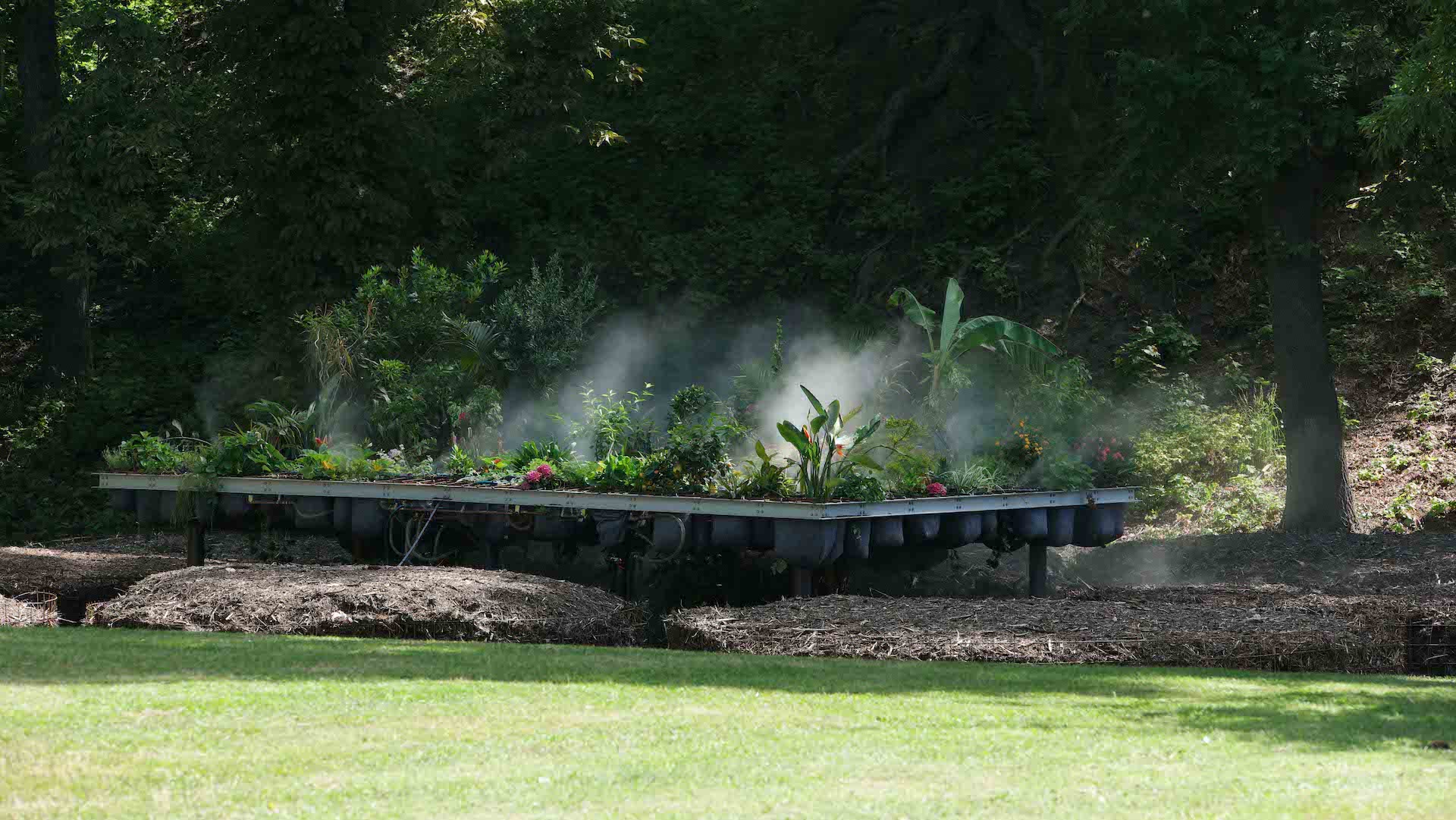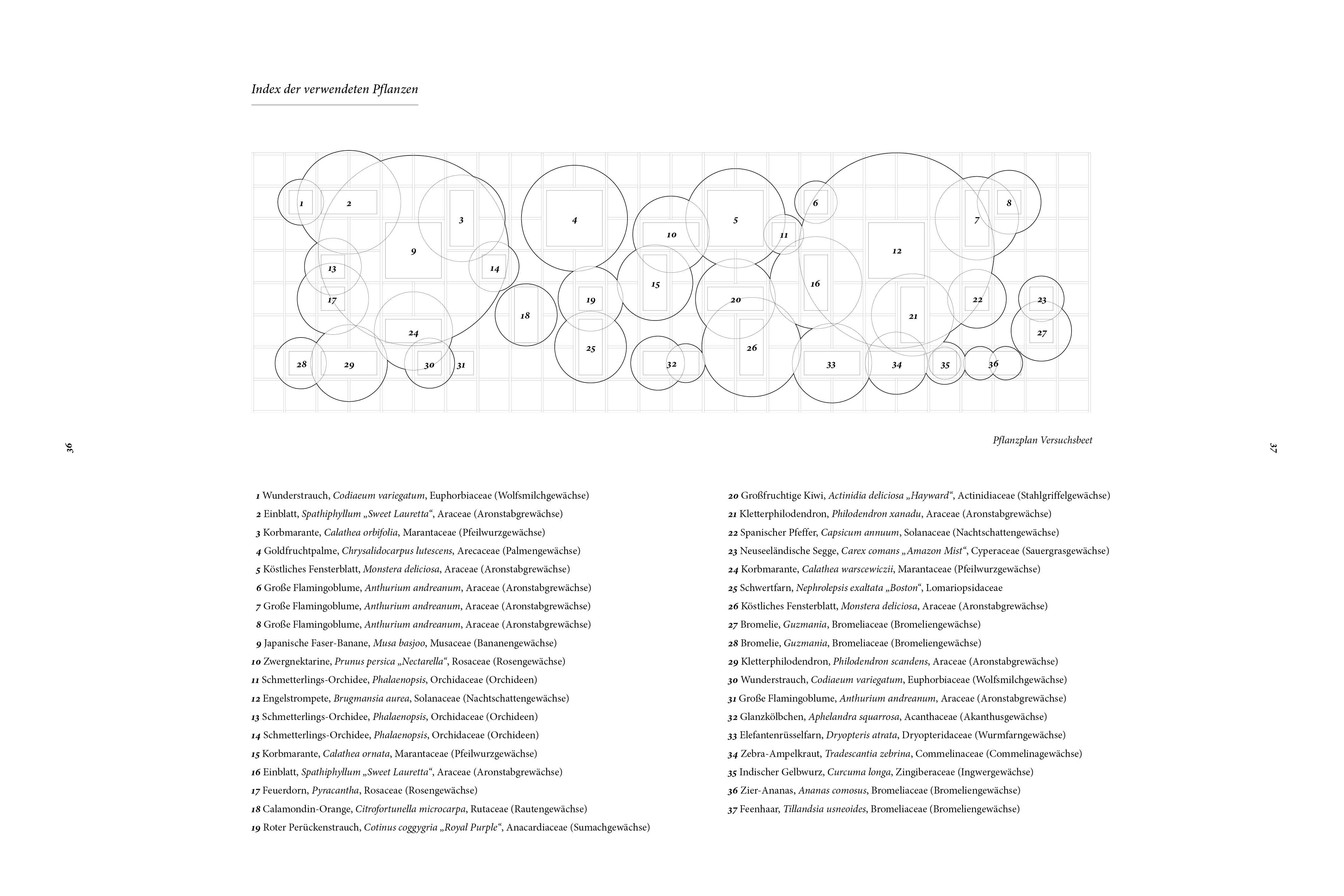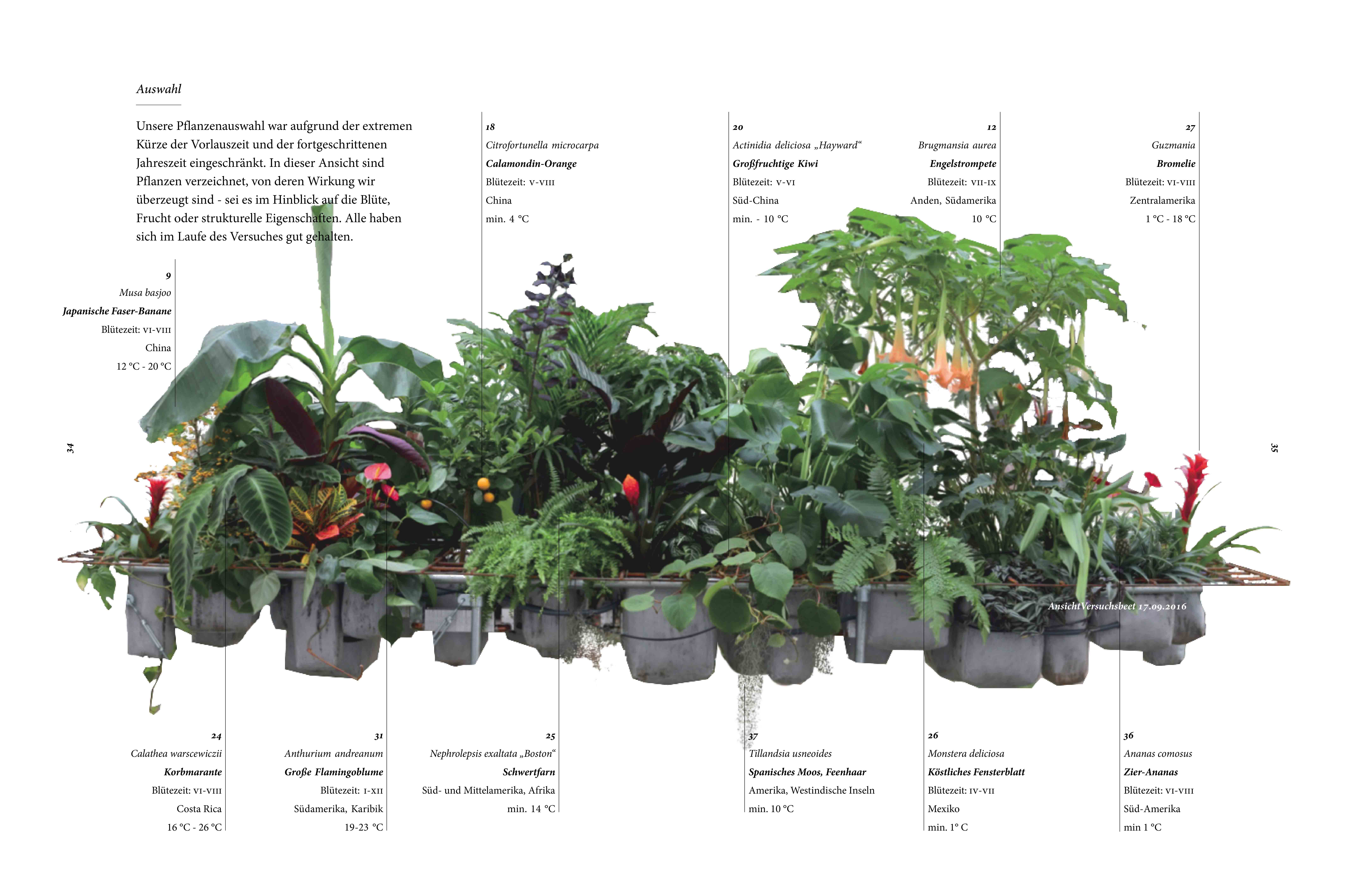 Aus dem Erläuterungsbericht: »Die Luft ist warm und es riecht nach feuchter, frischer Erde. Es ist seltsam windgeschützt zwischen den neun großen, dunklen, schwerfälligen Kompostkörpern. Die Formen sind unterschiedlich, manche groß und schlank, andere breit und flach. Der Tag zwischen den Erdformen ist halb Licht und halb Schatten. (...) Schwarze faustdicke Kabel laufen aus den Zylindern über den Boden zu einem scheinbar gemeinsamen Ziel. (...) Die Kabelenden laufen auf drei Meter Höhe in einen paradiesischen Garten. Das Beet steht schräg im Hang, die Wiese darunter ist begehbar. Die bepflanzte Fläche ist nur wenige Meter entfernt und ebenerdig zum höher gelegenen Weg. Tropische, bunte Pflanzen und Palmen wuchern nach oben, Luftwurzeln und Rankpflanzen wachsen zwischen den Stützen unter dem Beet und ergeben eine mit der Zeit dichter werdende Pflanzenhöhle. Plötzlich ein anschwellendes Rauschen, aus dem Beet steigt eine Dampfwolke empor, die den Garten in Nebel hüllt und langsam in kleinen Tropfen zu Boden rieselt oder einfach weggeweht wird. (...)
