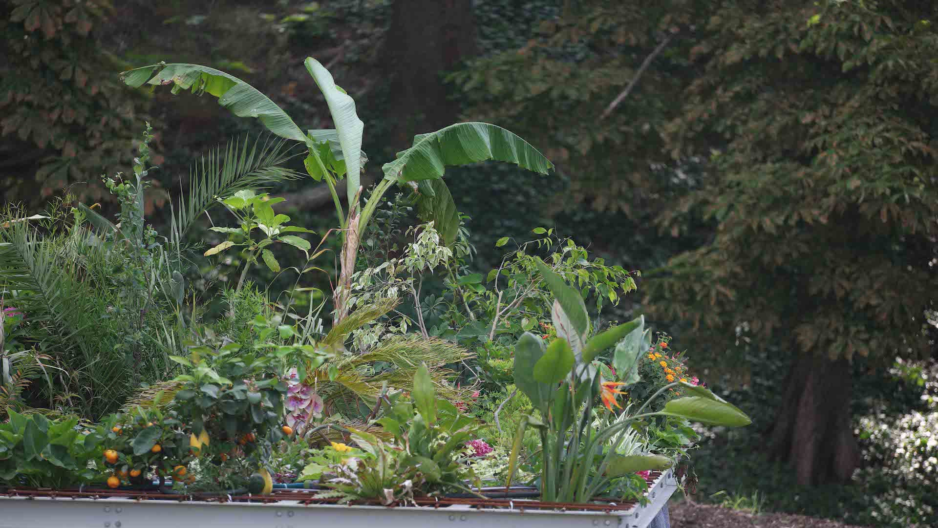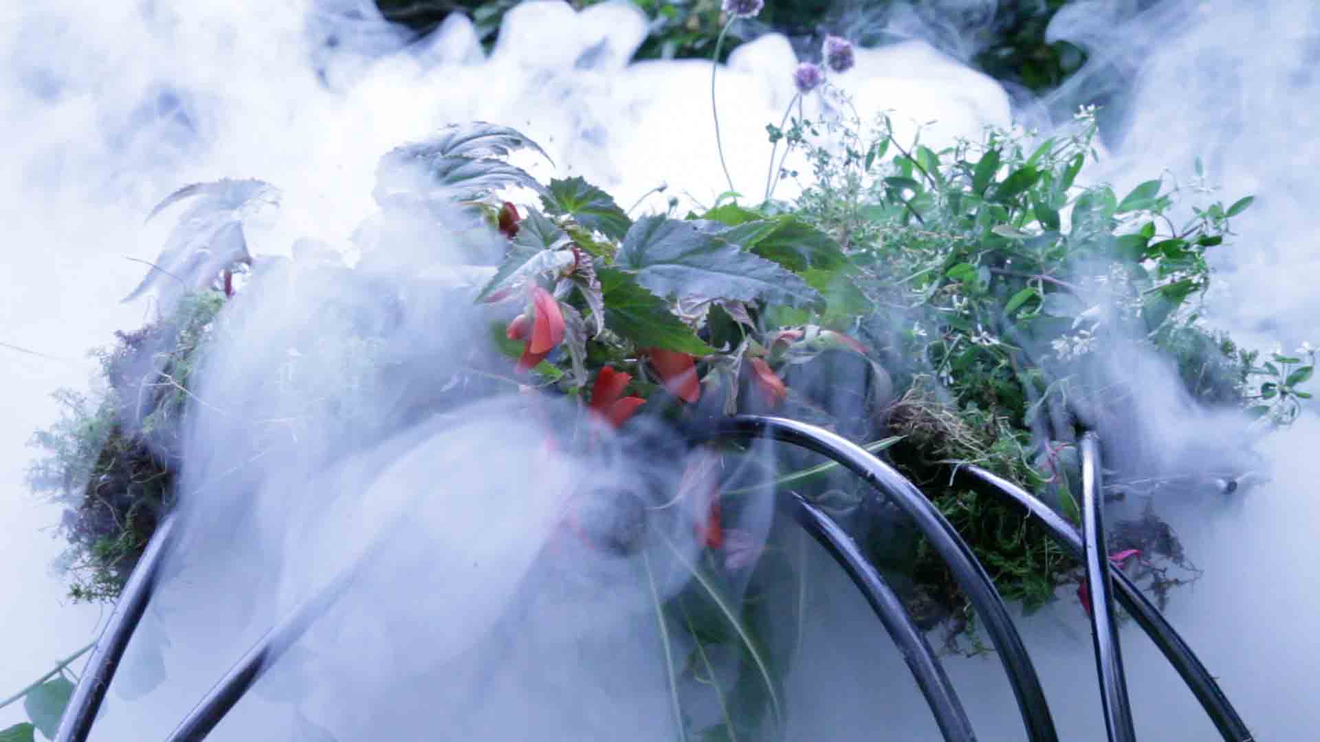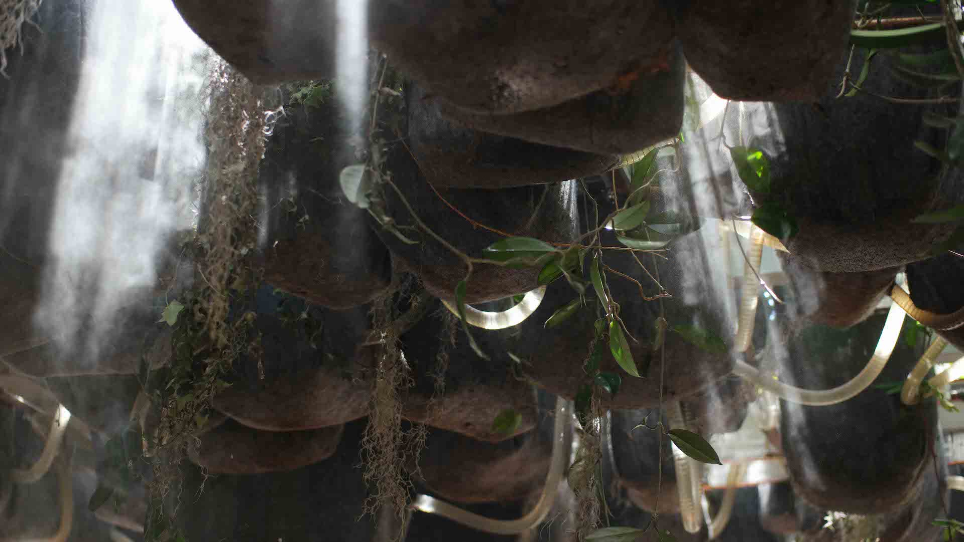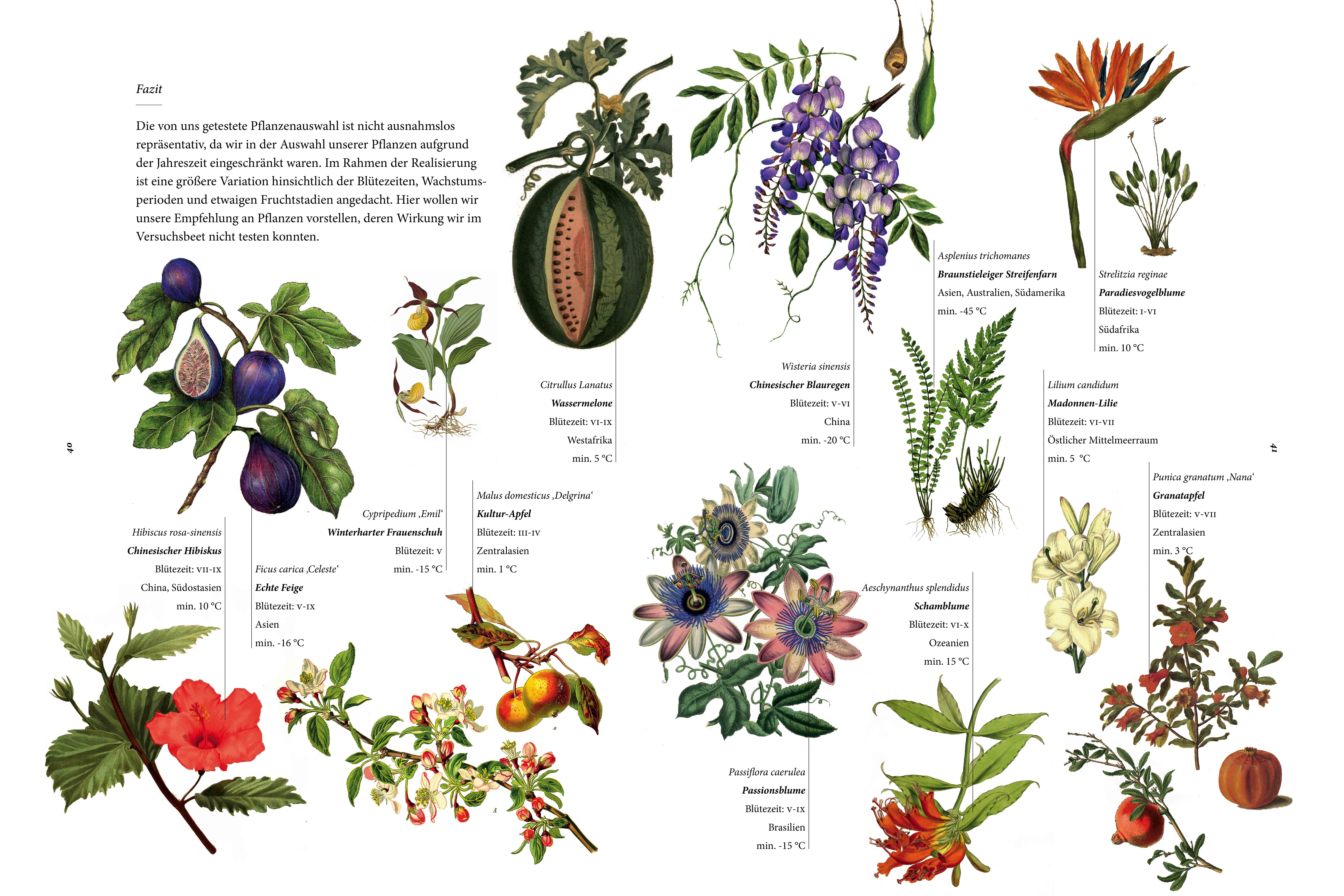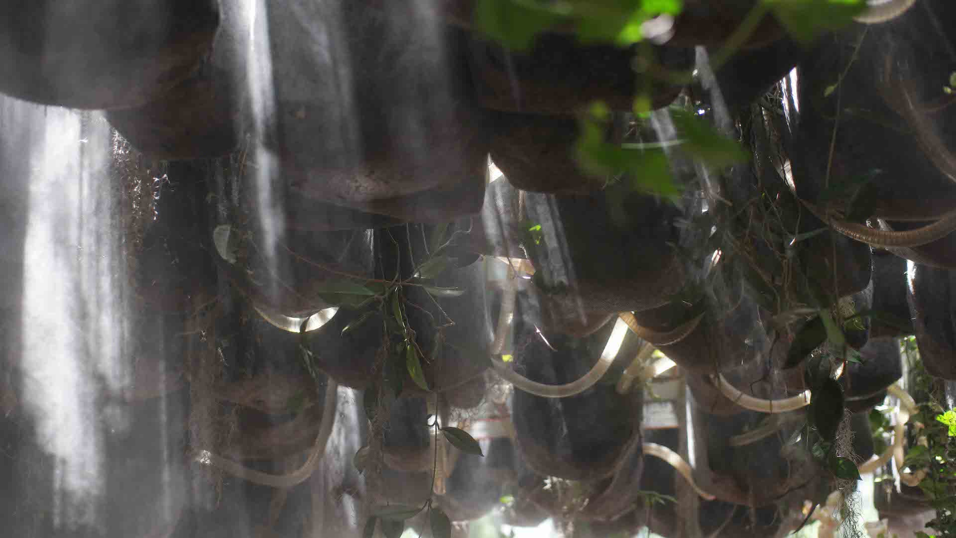 Aus dem Erläuterungsbericht: »Die Luft ist warm und es riecht nach feuchter, frischer Erde. Es ist seltsam windgeschützt zwischen den neun großen, dunklen, schwerfälligen Kompostkörpern. Die Formen sind unterschiedlich, manche groß und schlank, andere breit und flach. Der Tag zwischen den Erdformen ist halb Licht und halb Schatten. (...) Schwarze faustdicke Kabel laufen aus den Zylindern über den Boden zu einem scheinbar gemeinsamen Ziel. (...) Die Kabelenden laufen auf drei Meter Höhe in einen paradiesischen Garten. Das Beet steht schräg im Hang, die Wiese darunter ist begehbar. Die bepflanzte Fläche ist nur wenige Meter entfernt und ebenerdig zum höher gelegenen Weg. Tropische, bunte Pflanzen und Palmen wuchern nach oben, Luftwurzeln und Rankpflanzen wachsen zwischen den Stützen unter dem Beet und ergeben eine mit der Zeit dichter werdende Pflanzenhöhle. Plötzlich ein anschwellendes Rauschen, aus dem Beet steigt eine Dampfwolke empor, die den Garten in Nebel hüllt und langsam in kleinen Tropfen zu Boden rieselt oder einfach weggeweht wird. (...)