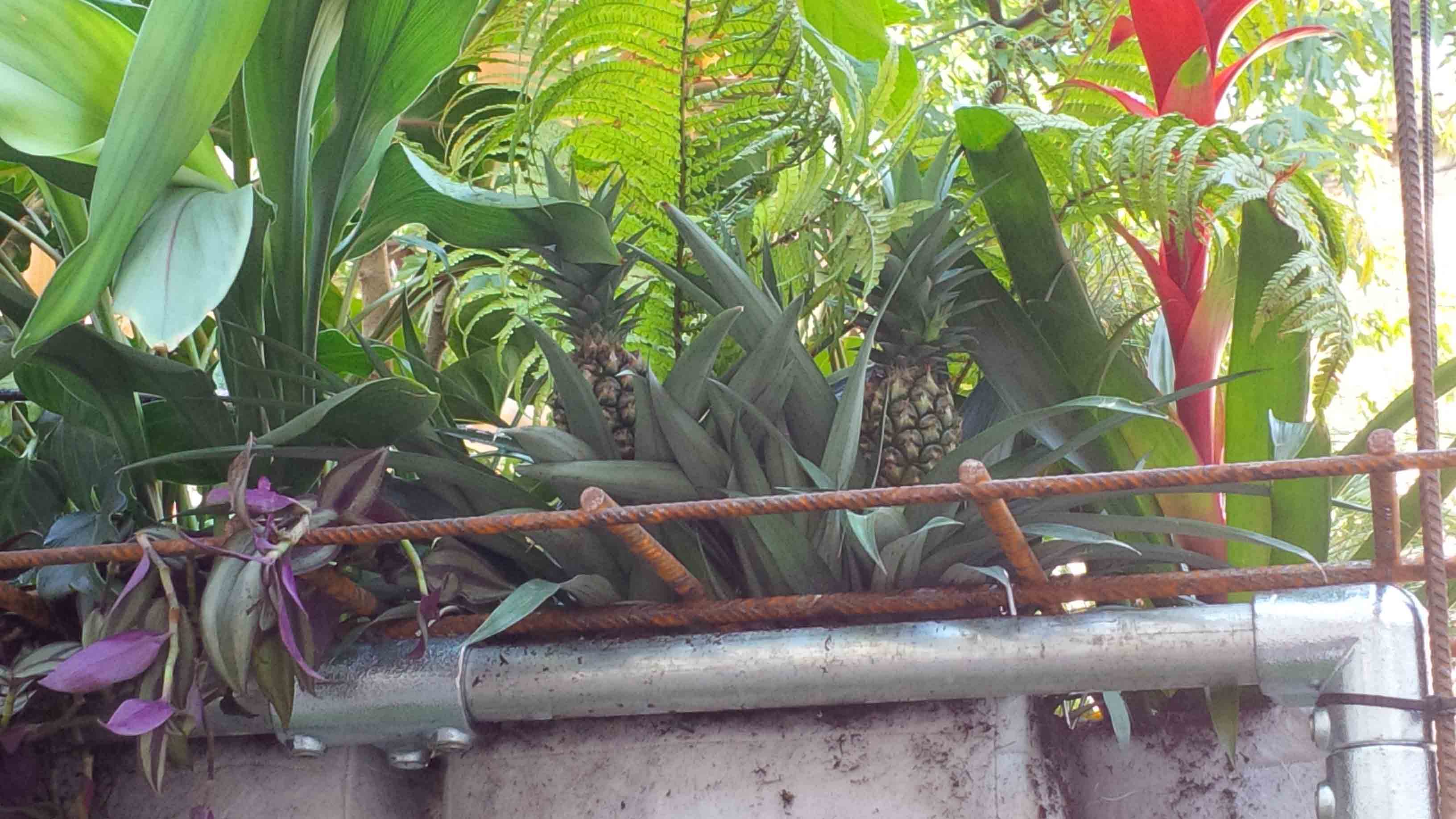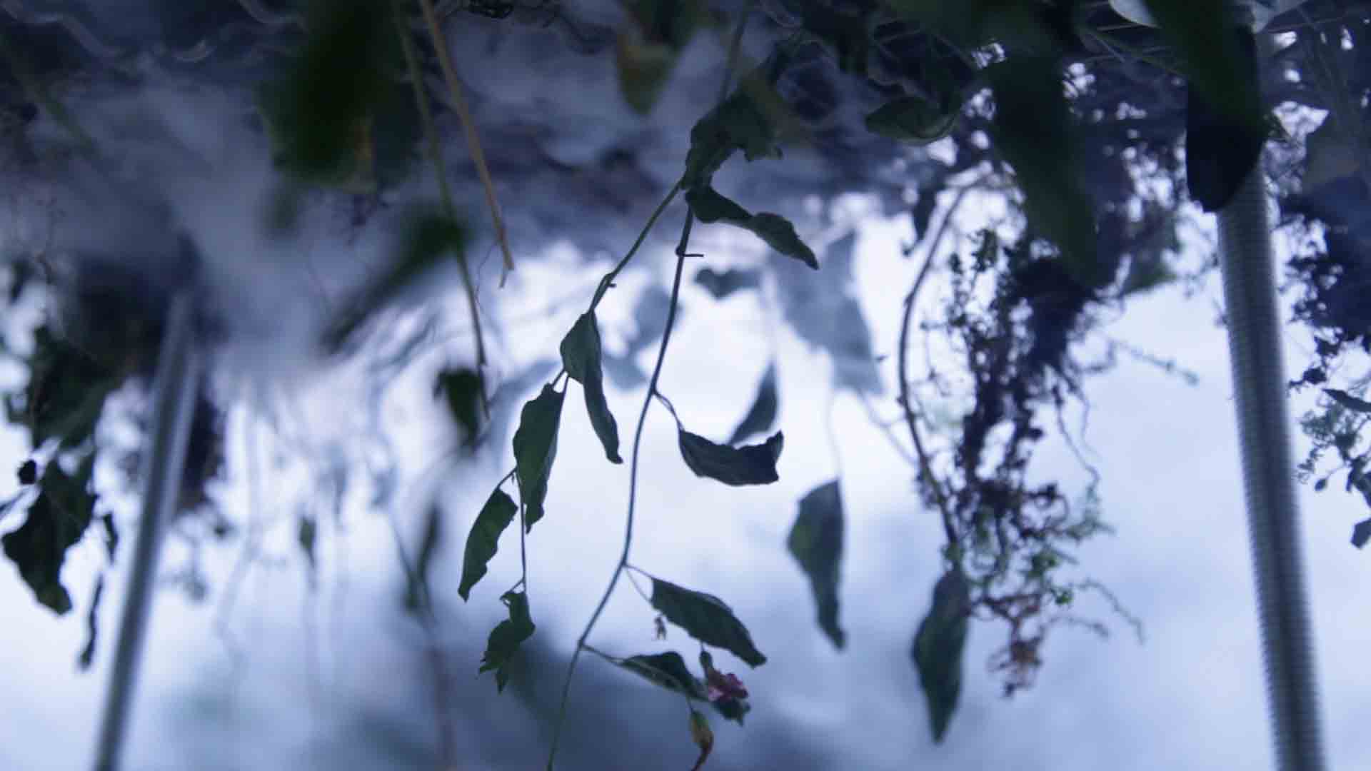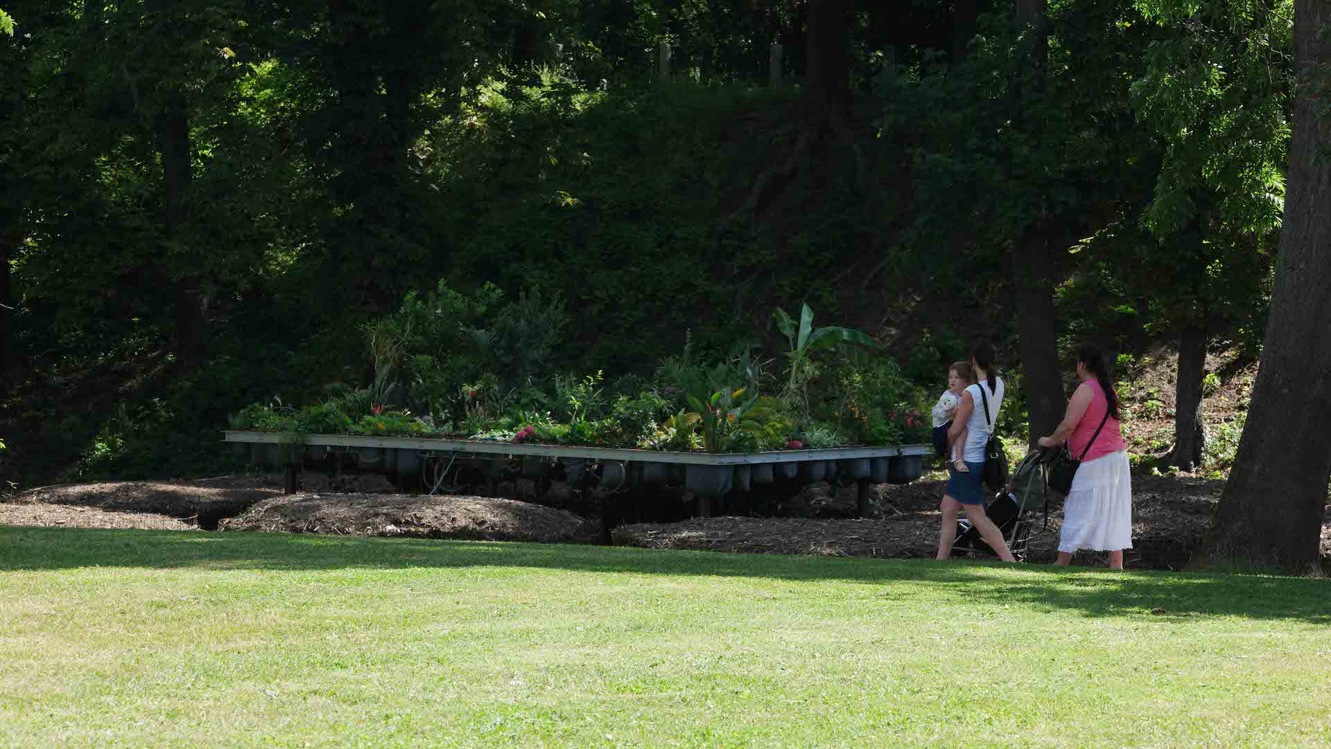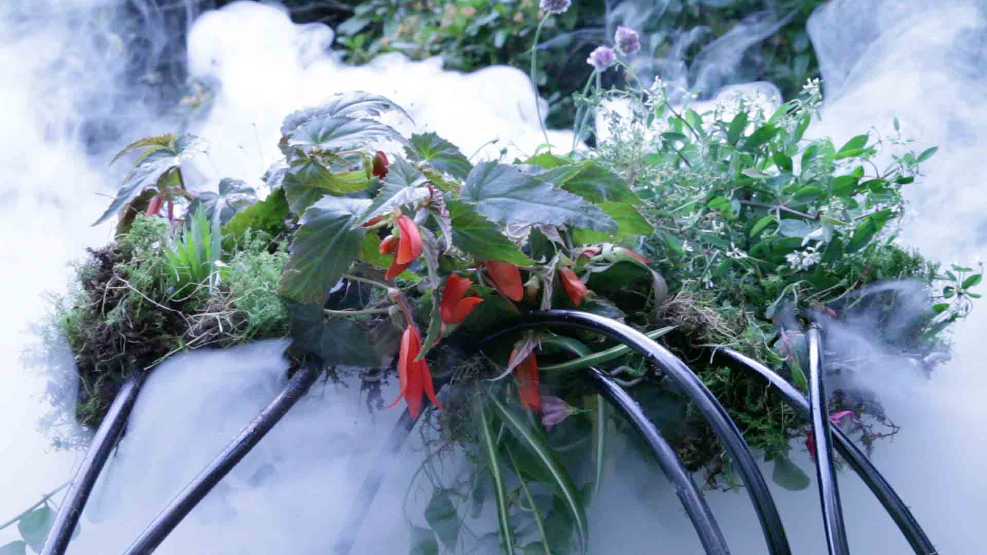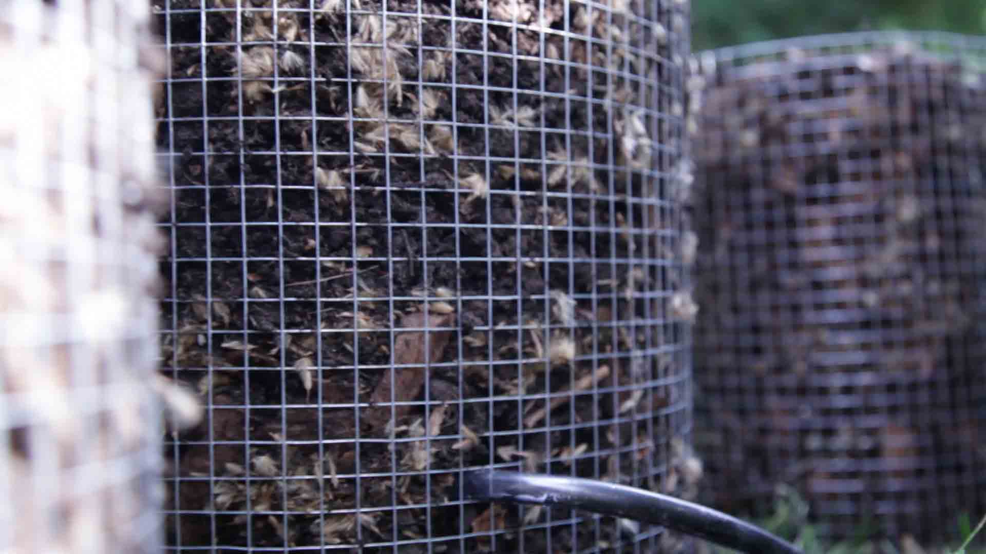 Aus dem Erläuterungsbericht: »Die Luft ist warm und es riecht nach feuchter, frischer Erde. Es ist seltsam windgeschützt zwischen den neun großen, dunklen, schwerfälligen Kompostkörpern. Die Formen sind unterschiedlich, manche groß und schlank, andere breit und flach. Der Tag zwischen den Erdformen ist halb Licht und halb Schatten. (...) Schwarze faustdicke Kabel laufen aus den Zylindern über den Boden zu einem scheinbar gemeinsamen Ziel. (...) Die Kabelenden laufen auf drei Meter Höhe in einen paradiesischen Garten. Das Beet steht schräg im Hang, die Wiese darunter ist begehbar. Die bepflanzte Fläche ist nur wenige Meter entfernt und ebenerdig zum höher gelegenen Weg. Tropische, bunte Pflanzen und Palmen wuchern nach oben, Luftwurzeln und Rankpflanzen wachsen zwischen den Stützen unter dem Beet und ergeben eine mit der Zeit dichter werdende Pflanzenhöhle. Plötzlich ein anschwellendes Rauschen, aus dem Beet steigt eine Dampfwolke empor, die den Garten in Nebel hüllt und langsam in kleinen Tropfen zu Boden rieselt oder einfach weggeweht wird. (...)